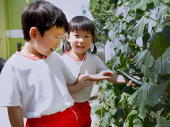 「食」に関心を持ち、「食べる」ことの大切さをもっと感じてもらうために、園では子どもたちが、トマトやキュウリ、ナス、ダイコンなど、様々な野菜の苗を植えて育てています。自分たちが植えた植物が生長する姿をワクワク見守ったり、収穫の楽しさを味わい、食べるものへの関心を深めながら、食の大切さや自然や命に感謝する豊かな心を育てていきたいと思います。