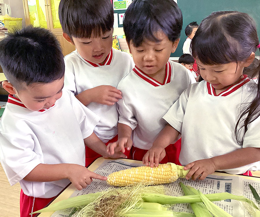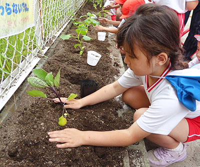 草花や生き物との出会い、自然とのふれあいは貴重な感動体験で、学びの場でもあります。園では季節の野菜の苗植えや収穫などを行い、水やりや草取りを通して、自然と身近にかかわりながら、その営みや有り難さを学ぶことに力を入れています。