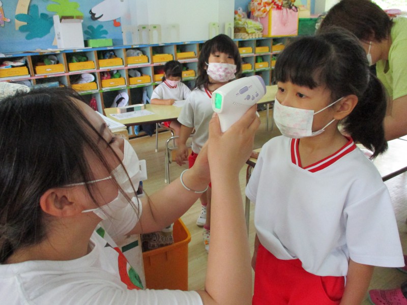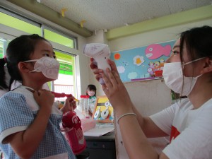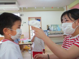 毎日登園してきた子から非接触型赤外線温度計を使って検温をします。