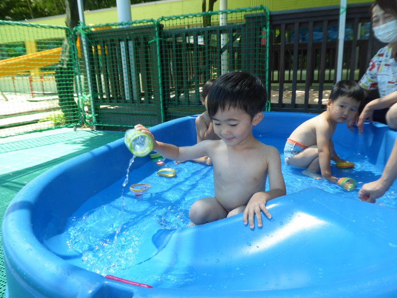 コロナウイルスの影響でお休みしていた一時預かりも、6月1日から再開しました。天気の良い日は外で遊んだり、水遊びをしたりして楽しく過ごしています。是非ご利用ください。